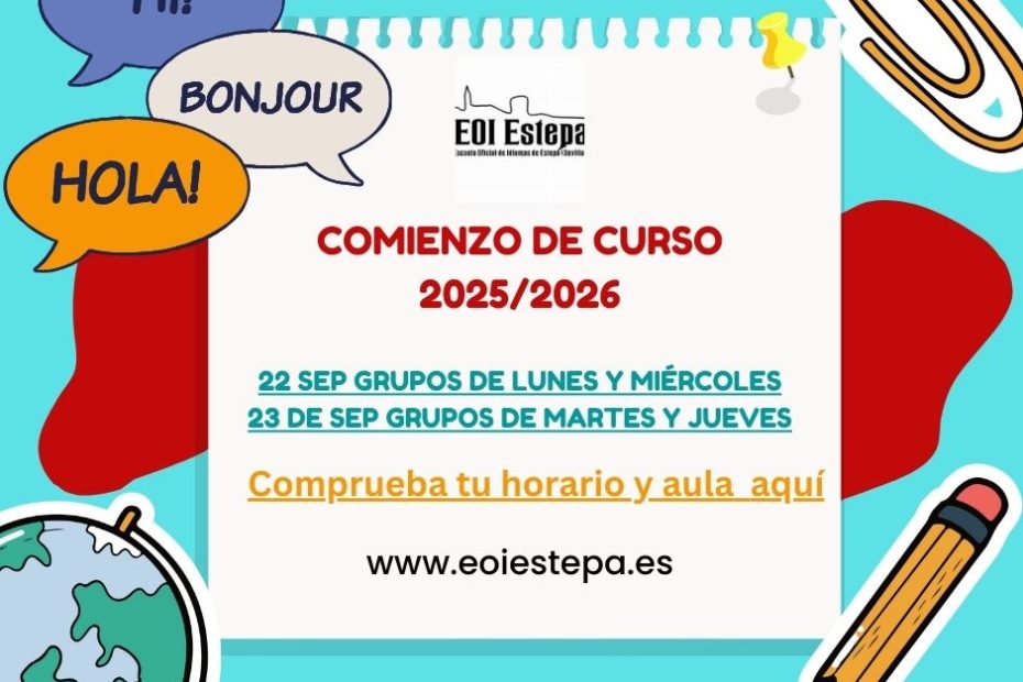 Comienzo de curso19 septiembre, 202519 septiembre, 2025Francés, Inglés, Principal La semana próxima comienzan las clases. Puedes consultar tu horario aquí.
