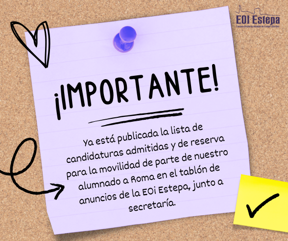 Ya puedes consultar la relación de candidaturas admitidas y en reserva para la movilidad del alumnado a Roma en el tablón de anuncios de la EOI Estepa. ¡Enhorabuena a los/la seleccionados/as!